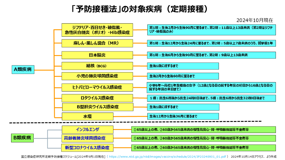 ワクチンは大きく「定期接種」と「任意接種」とに分かれます。定期接種とは「予防接種法」に定められた病気に対するワクチンのことで、2024年10月時点で子どもでは14種類あります(図1)。